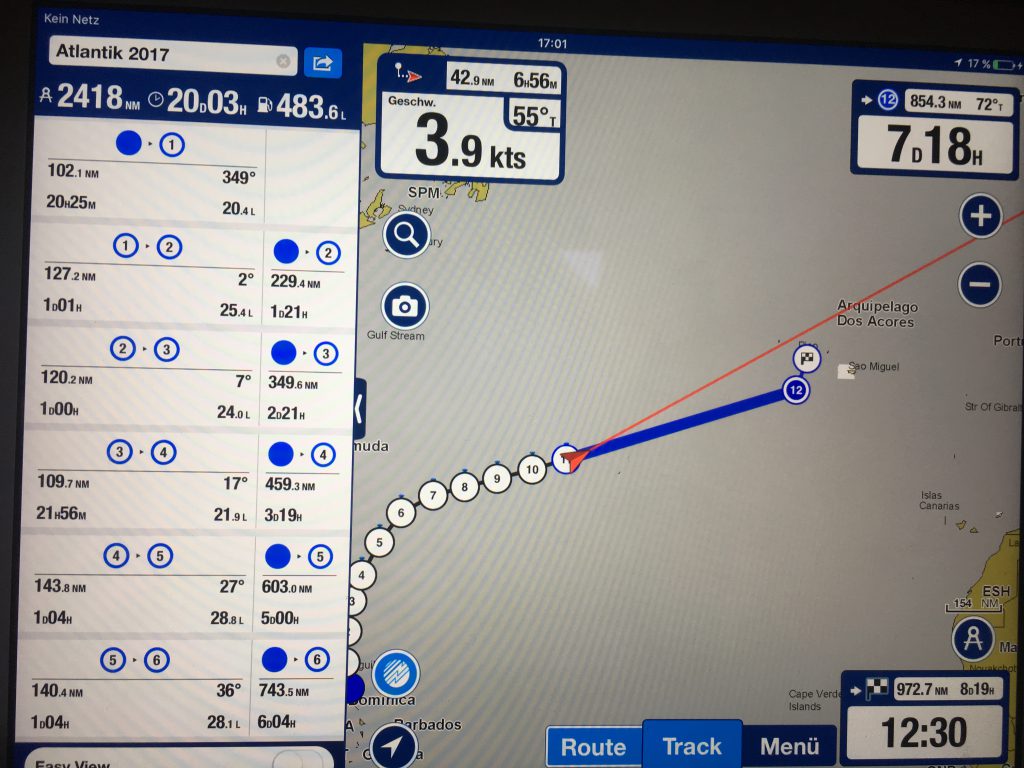 Am Vormittag setze ich mich dann mal mit dem Navionics vom Schmid auf seinem IPad auseinander. Neben der Wache ist nun Dank dem Autopilot wieder Zeit für sowas. Sonst beschäftige ich mich abwechselnd mit meinem Buch „der Erfolg“ von Leon Feuchtwanger, einem nun schpn älteren Spiegel und dem Tagebuch hier. Ich gebe also in die App rückwärts alle die in dem Logbuch ordentlich notierten Positionen ein und erstelle so eine Route, die uns zum einen Aufschluss über die bereits gesegelten Meilen und Etmale geben kann und zum anderen die noch zu segelnde Strecke errechnet. Wie immer ist so ein Programm toll, wenn man die Möglichkeiten erfasst hat, aber bis da hin…