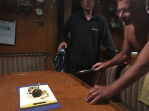 Mit einem Ständchen der gesamten Crew und einem Marzipankuchen mit vier Kerzen beginnt die Nulluhrwache und mein 40ster Geburtstag. Die Geburtstagskekse von Evi und der kleine Valdo werden verzehrt. Ein kurzer Anruf in München bei meiner lieben Frau, die gerade aufgestanden seien sollte, über Satellit ist auch drin. Ich freue mich sehr sie zu hören.