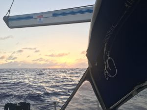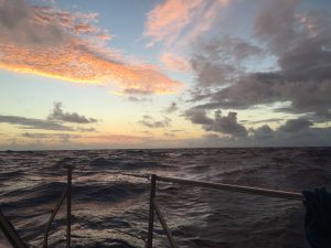 Kurz reden wir noch über das Manöver, welches wohl zum Reffen des Groß notwendig war. So ganz logisch sei es nicht gewesen, meint der Schmid. Naja , der Skipper und der Salat liegen jetzt im Salon und der Schmid hat als Feuerwehrmann nun doch seine Nachtwache gemacht. Der Wind hat aufgefrischt, wir haben jetzt konstant 20 kt und Böen bis 25 kt Kurs 20 Grad. Wegen des gerefften Groß rollen wir deutlich mehr. Eine Frage müssen wir noch klären: Wer kann das Klo nicht bedienen? Es steht Wasser auf dem Boden…