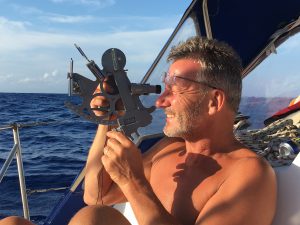 Elke und der Schmid schießen mit dem Sextant ein paar mal die Sonne ab und wollen unsere Position errechnen.