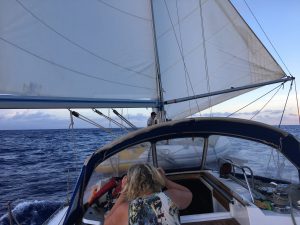 5:00 Uhr Wache, jetzt zumindest unter Segeln. Zusätzlich habe ich einen Punkt zur Orientierung am Horizont, ich segle in den Sonnenaufgang. Elke bleibt noch einen Moment und wir ratschen die Wache durch.