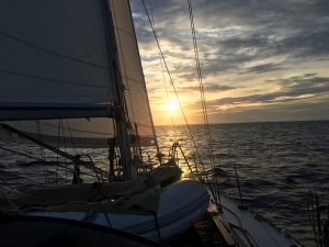 5:00 Uhr Wache, jetzt zumindest unter Segeln. Zusätzlich habe ich einen Punkt zur Orientierung am Horizont, ich segle in den Sonnenaufgang. Elke bleibt noch einen Moment und wir ratschen die Wache durch.