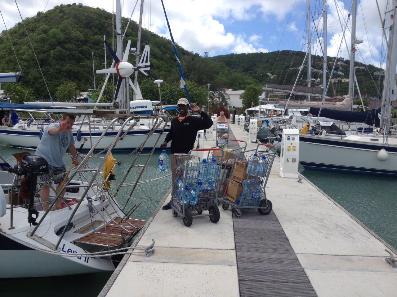 Die Lebensmittel sind verstaut, der Schmid und ich schauen uns an, das Bier (4 Paletten) langt nie. Der Schmid und die Elke gehen was Mittagessen ohne was zu sagen, dabei braucht der Peter doch ihren Pass um auszuklarieren. Hatte er angeblich gesagt, dass das um 14:00 Uhr passiert, wohl nur nicht Elke oder auch keinem anderen. Naja egal, dackeln wir halt durch die Marina und suchen den Pass mit seiner Besitzerin. Mit dem Pass geht’s dann zum Zoll, die Immigration, ins Hafenbüro und wieder zurück. Hier noch ein Stempel, dort noch ein Crewliste, die wieder stempeln und dann noch 30 $ US pro Nase für die Ausreise und gut.